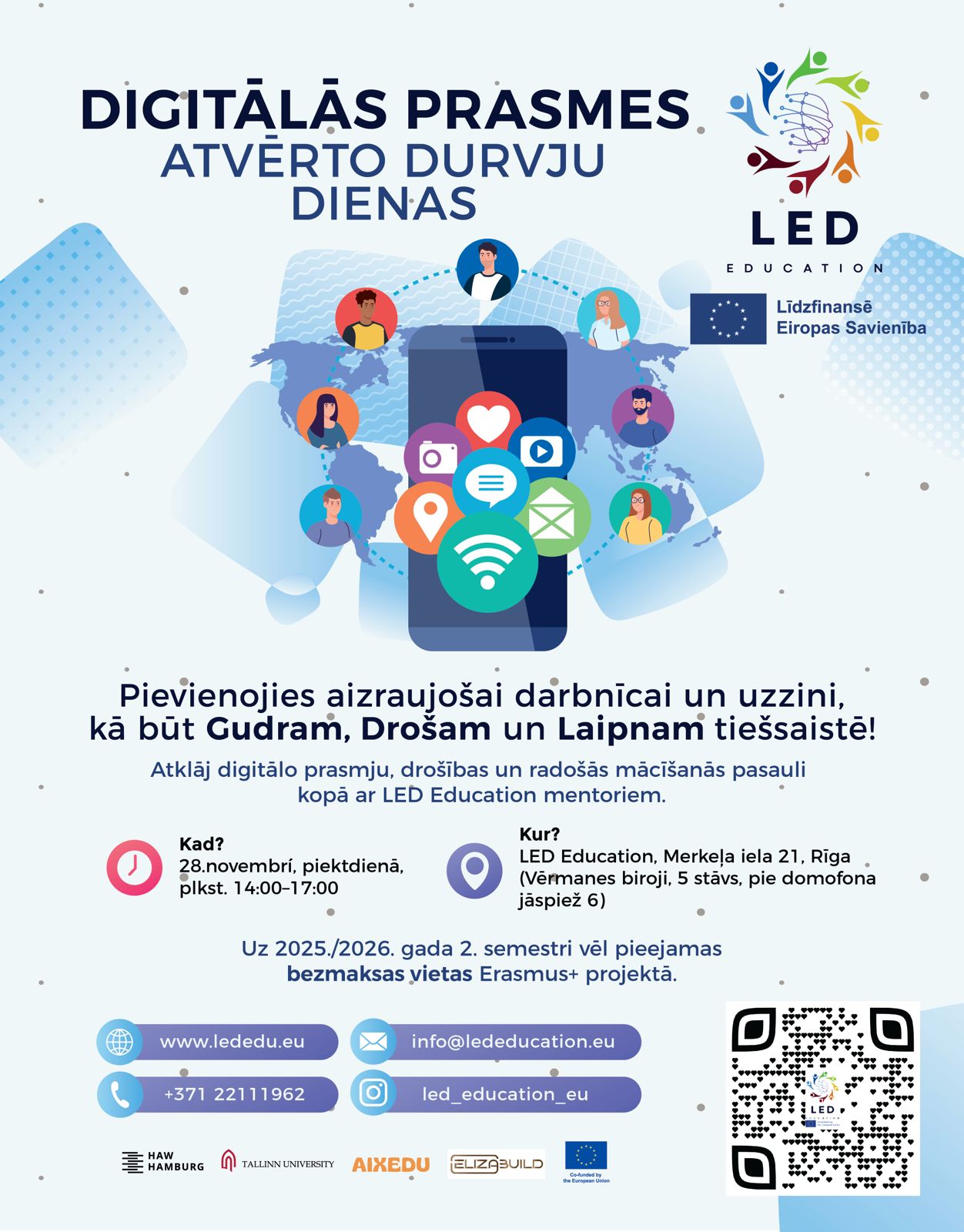 Pievienojies aizraujošai darbnīcai un uzzini, kā būt Gudram, Drošam un Laipnam tiešsaistē! Atklāj digitālo prasmju, drošības un radošās mācīšanās pasauli kopā ar LED Education mentoriem..